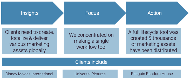 In 2010, Jollywise was creating and localising marketing assets for Disney Movies International, alongside assets from other agencies, all managed through a digital toolkit. With an increasing demand for assets—ranging from banner ads, overlays, microsites, and games to Facebook apps—the complexity of localisation and volume of work grew rapidly.