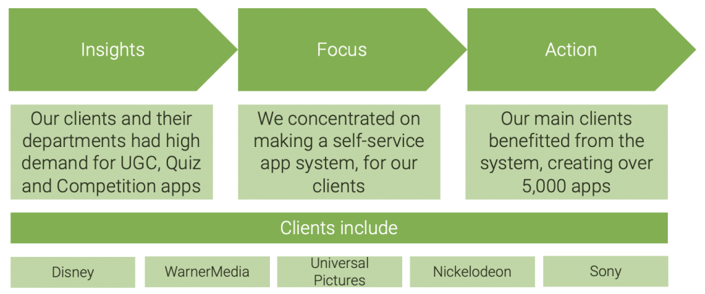 This self-service system not only saved us time but also reduced costs for clients by offering an annual subscription model, rather than a ‘per app’ fee. Trusted by industry leaders like Disney, WarnerMedia, Universal Pictures, Nickelodeon, and Sony, JollyApps continues to power global campaigns to this day.