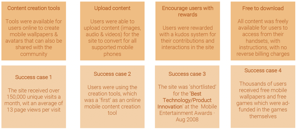 By 2008, mobclub attracted around 150,000 unique users each month, who accessed free mobile content like wallpapers, ringtones, videos, and animated greeting cards. We also integrated free mobile games that were funded through in-game ads.