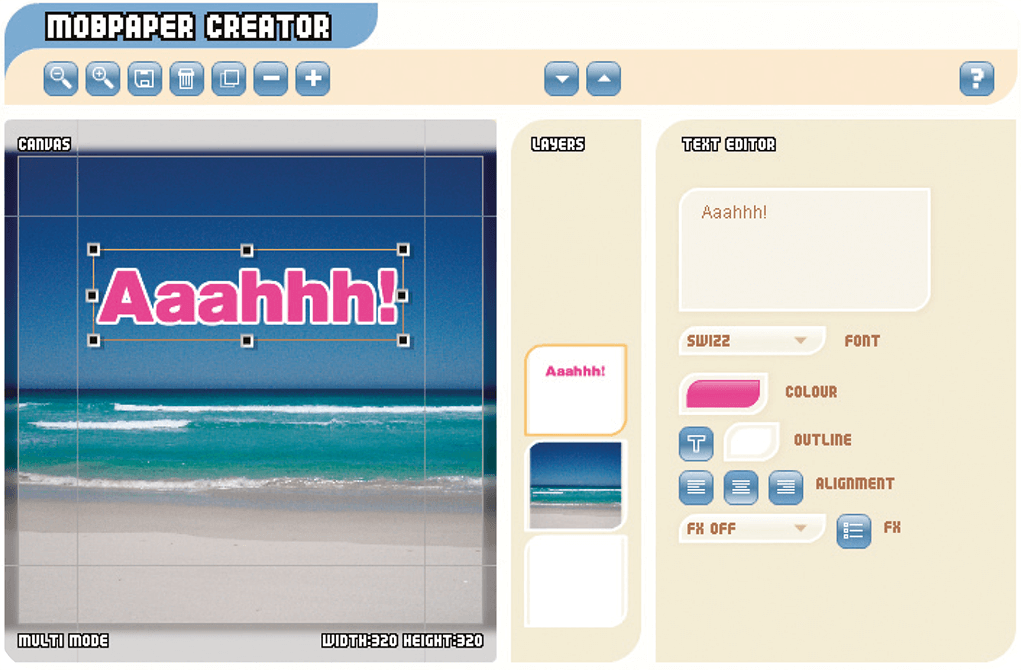 Using a pre-existing website framework that supported user registration, profiles, and forums from a previous multiplayer game project, we adapted it to include an online Flash-based image editor. This editor allowed users to create a “master” image, which the server would automatically resize to fit the screen dimensions of different mobile handsets. Over time, we expanded support to include more content types, including ringtones, animated greeting cards, and mobile games.
